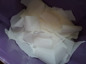 very thin paper, or tissue paper – I bought my roll at a beauty supply store. Do not use printed paper