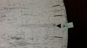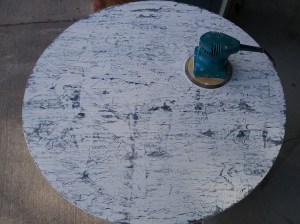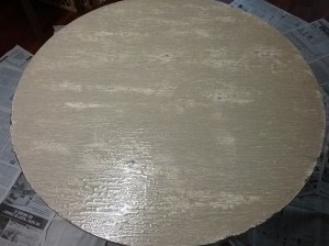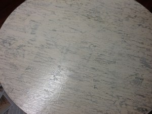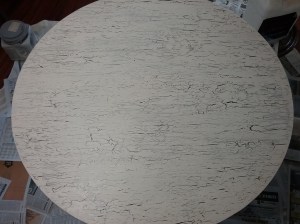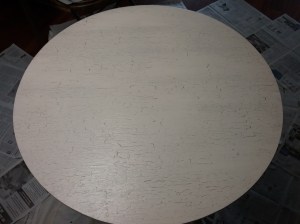 Colonial Beige paint was put on over the crackle, and sanded after it dried. Another layer of crackle was put on before the final layer of Stowe White paint. Sand again when dry.