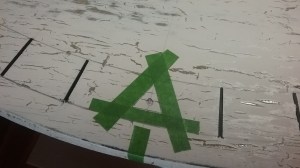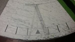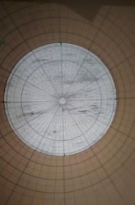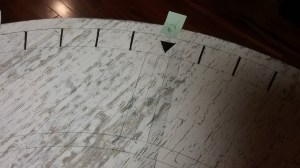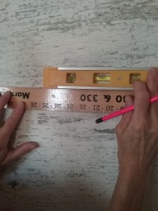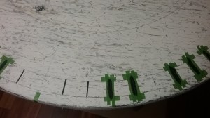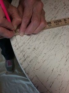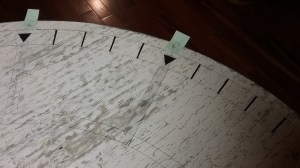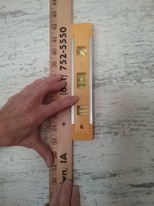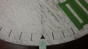 Stand the circle up as straight as possible against a wall, with the back side facing you. Use the yardstick and a level to draw a centered line down from the mark on the tape and over the nail hole. Lay the clock down. Go out 8″ on each side of this centered line and draw two more lines.