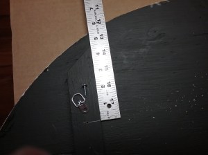 Carefully remove the nail. Use a small piece of cardboard under the claw of your hammer so you don’t leave a pressure mark on the clock. Flip the clock over. Measure 4 1/2″ down from the top inside tip of the pine strips, center and attach D-rings. Find a place to hang the clock, level, so you can use the overhead and template for marking. The clock must be level before doing any marking or drawing. I removed my clock from the wall and hung this one in its place until I was finished.