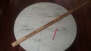 Circles need to be drawn before the numbers are added. Push, or tap, your nail through the center hole from the backside of the clock, through the paint. Lay the clock face up. Tap the nail into the hole, leaving enough protruding to put the yardstick on, to draw circles. My nail usually goes right into my old table top and holds the clock firm.