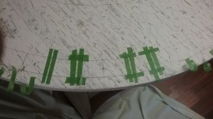 For the #4, begin with the 5/16″ strip laid over the drawn line, as spacing. All spaces will be 5/16″. The numerals will be 7/16″.