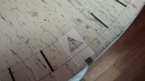 Draw a triangular stencil for your numeral marks. Mark the center on the outer side of your triangle. Line up that mark and the point of the triangle on the faint line drawn with the yardstick. Trace inside the triangle. Repeat at each numeral. Tape them off and paint them like the minute marks, one coat crackle, two coats black.