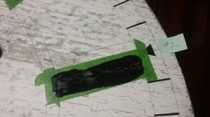 The paper pieces were glued on with a thin layer of white glue. After they were smoothed and air bubble free, I clamped the mirror pieces and spare foam board pieces over them to ensure they would dry flat and stay smooth. Glue the paper accent on the arch and weigh down to dry.