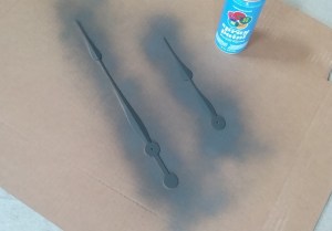 Carefully remove the plastic protective covering from the clock hands. Spray them with a black matte finish. Let dry.