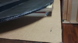 Cut a thin piece of clear glass for the frame opening. Stand the box on it’s top and fold lid down flat. Position the glass on the inside of the lid, covering the opening. Slowly, lower the box down over the glass to make sure it fits inside the box and doesn’t hinder closing. Use small dabs of E6000 to glue the glass in place. Be careful not to use too much glue or it will seep to the front and you’ll have some cleaning to do. For cushion, and to help even out weight, lay a couple pieces of foam board across the glass before weighing with books to dry.  I squeezed small dabs of E6000 on the backside corners and edges of my mirror pieces, and clamped them on the papered sides while the glass was drying.