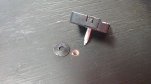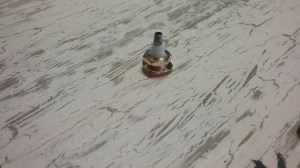 After the speckles have dried completely, use some books or something to raise your clock up off of the work surface. Drill through the nail hole with a 5/16″ bit. Push the stem of the clock movement, with the rubber pad on it, through the hole from the back, and tighten it on with the nut and washer provided. Hot glue a small piece of wood under the clock movement to hold it solid, and paint it black.