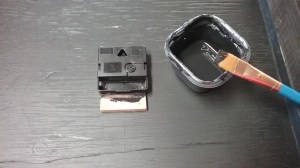Time to paint, we’ll start with the black base. Remove any tape from the clock. Paint the entire clock with black primer. Let dry. Cover the primer with a coat of black paint. Let dry. Replace a little piece of tape on the back to mark the top of the clock again, so you always know where it is.