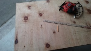 Lay the plywood face up on a work surface you can easily walk around. Determine the best place to draw the circle. Knot holes are not usually a problem, they can lend a lot of character, but you don’t want to cut through one on the rim of the clock. Hammer a 1 1/2″ finishing nail where the center of the clock will be.