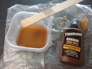 After deciding the placement of the flower, I scratched a small circle of paint off of the bucket, and also made sure the bottom of the flower was paint free. I used a wooden skewer to stir a small amount of epoxy together on wax paper, and let it rest about five minutes to set up a little.
