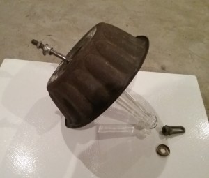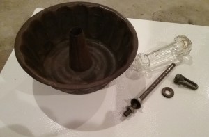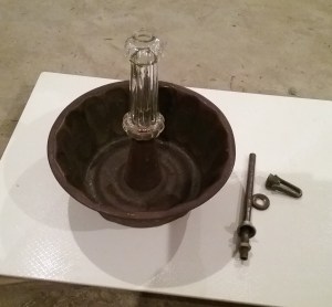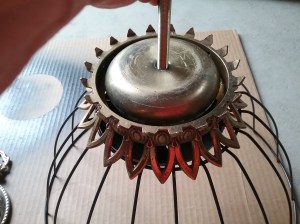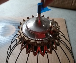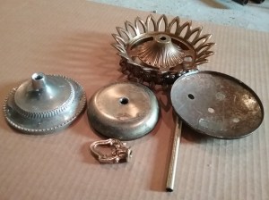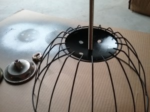 I gathered some odd lamp pieces and a short piece of threaded rod to stack and build a large finial to adorn the top of the upturned basket. One lamp piece (the base piece) will need to fit nicely inside the basket below where the crossbars were.