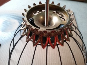 A wire stem was inserted through the small metal loop on the bottom the bell, and squeezed tight. Some loops were brittle from rust, which made them fragile. I pre-shaped my wires before inserting them to avoid any unnecessary pressure, or twisting, on the loop.
