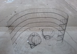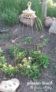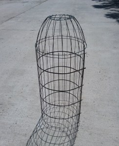 I’m sure I’m not the only one using tomato cages, or garden fencing, to protect plants and new sprouts in the garden and yard. Rather they’re protecting from animals, grand kids, or an inattentive mower, they can sometimes stay put most of the summer. That’s what made me think of a large garden cloche; if you’re going to look at it for months, why not make it more attractive? And, no one else will have one like it … that’s always a bonus, right?