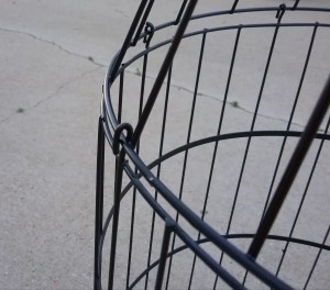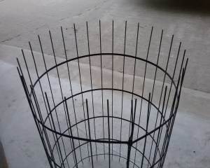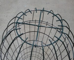 I quickly realized I could not bend and shape the steel AC guard to match the 14″dia. of the planter basket with just my hands. After searching around, I finally found an old milk can of that size to roll, wrap, and shape it around. I used bolt cutters to cut the length of guard needed, then connected the ends together by wrapping the entire length of the seam with thin wire, crisscrossing the wire at the intersections, for a smooth seam and firm connection. Cut the wires from bottom ring, leaving prongs to push into the ground.