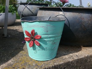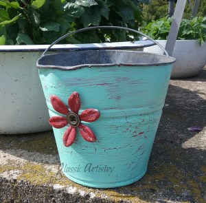 Several new pieces were made for the market we participated in. I’ll post some pictures of them later, but first, I’d like to begin by sharing a favorite … an upcycled, little, bent galvanized bucket that was almost headed to the scrap yard. I’ve just fallen in love with it, and it was so easy. All it took was two sample sized colors of exterior water based paint, hide glue or crackle medium, J-B Weld, a small metal flower, one button, and a fan (opt). I’m impatient, the fan speeds up drying times.