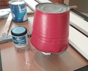 After giving the bucket a good wash, it was wiped down with a little rubbing alcohol to remove any oils left on it’s surface. I began with a base coat of red, let dry.