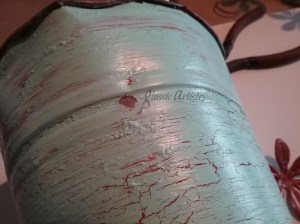 Lightly burnish the metal flower with steel wool before painting. I used the light blue as a base color, and the red as the top coat, with crackle in between.