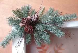 I drew a large holly leaf pattern about 20”L and 12”W, then cut eight holly pieces out of newspaper to arrange on the circle and give them a look. Sorry, the picture is a little fuzzy, but I liked the design.