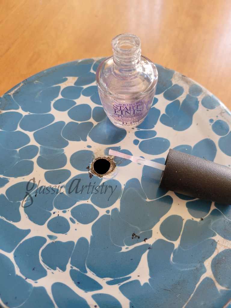 Before starting, a ⅜” hole was drilled in the center of the zinc lid, and a 11/32” hole was drilled in the bottom center of the wooden finial. The hole in the finial is slightly smaller so the threaded rod will fit snugly. An assortment of washers and nuts were found to fit the threaded rod.