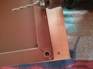 Three screws holding the metal table top were removed. The screws were too short to be used again. The metal top was centered on one of the boards, flush on the back edge.  Holes were drilled down through the existing screw holes, through the metal and into the wood. Flip the metal top over so the finished side is up. Check to see if the holes line up nicely, if not make adjustments. This stacked piece will be the base of the table when finished.