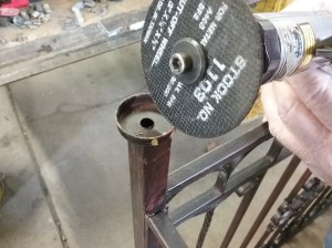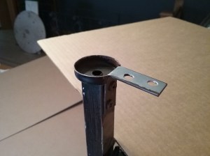 A slot was marked on the inside of the legs, on each end of the table, to accommodate a 1/2″ wide bracket. Cut the metal with a cutting wheel on a die grinder. Position the brackets so the tops are flush the the top of the legs, screw into place.