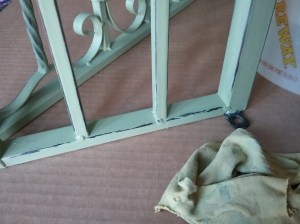 The metal table frame was painted with two coats of Brisk Olive green paint, drying completely between coats. Distress the edges by rubbing the paint off with a dampened cloth.