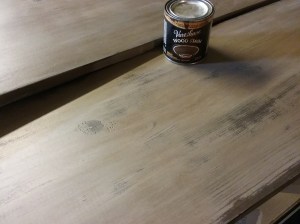All surfaces of the boards were brushed very lightly with streaks of Granite Dust, Gravity, and Stowe White in a random pattern. Let dry completely, repeat. Let dry completely again, then sand to see the grain. Wipe with a tacky cloth to remove any dust before staining with a Dark Walnut wood stain. Let dry overnight. To finish, following the directions on the can, wipe on two light coats of low gloss Tung Oil Finish. Dry completely.