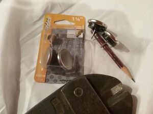 I’ve been saving an old necklace from my high school years because I liked the fleur-de-lis (never thought I’d be using it for something like this). The link at the top of the fleur-de-lis was pretty weak and bent right off without leaving any sharp edges. I sprayed it to match the handles and let it dry.